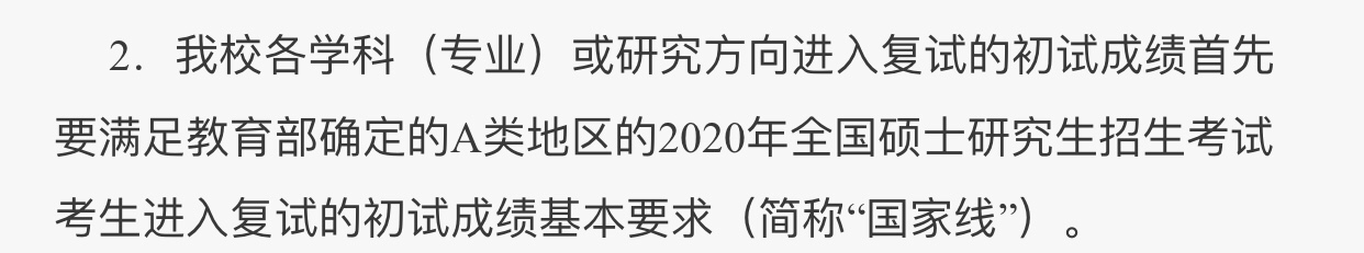 各學科(專業)或研究方向進入復試的初試成績首先要滿足教育部確認的A類地區的2020年全國碩士招生考試考生進入復試的初試成績基本要求(簡稱“國家線”)。