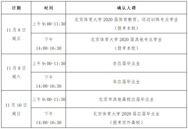 注:本公告僅適用于選擇北京體育大學(xué)報(bào)考點(diǎn)的考生;選擇其他報(bào)考點(diǎn)的考生應(yīng)根據(jù)各報(bào)考點(diǎn)要求于指定時(shí)間到指定地點(diǎn)進(jìn)行“現(xiàn)場(chǎng)確認(rèn)”,不參照本通知。