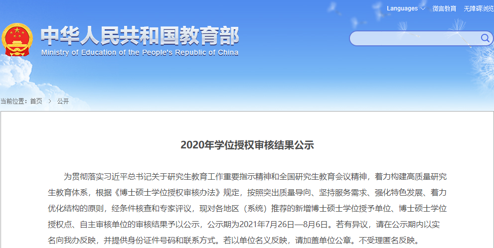 為貫徹落實習近平總書記關于研究生教育工作重要指示精神和全國研究生教育會議精神,著力構建高質量研究生教育體系,根據(jù)《博士碩士學位授權審核辦法》規(guī)定,按照突出質量導向、堅持服務需求、強化特色發(fā)展、著力優(yōu)化結構的原則,經(jīng)條件核查和專家評議,現(xiàn)對各地區(qū)(系統(tǒng))推薦的新增博士碩士學位授予單位、博士碩士學位授權點、自主審核單位的審核結果予以公示,公示期為2021年7月26日—8月6日。