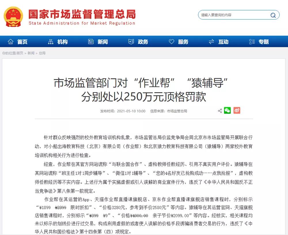 2021年5月10日,北京市市場監管局依法對作業幫和猿輔導兩家校外教育培訓機構,均處以警告和250萬元頂格罰款的行政處罰。下一步,市場監管總局將持續聚焦民生領域案件,加大校外教育培訓機構執法力度,嚴厲打擊各類違法違規行為,規范市場經營秩序,維護人民群眾合法權益。