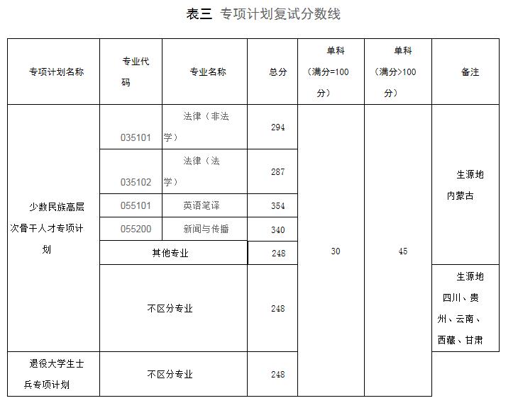 專業在符合國家線的基礎上進行自劃線。普通計劃見表一和表二,專項計劃見表三。表中低于國家B類線的