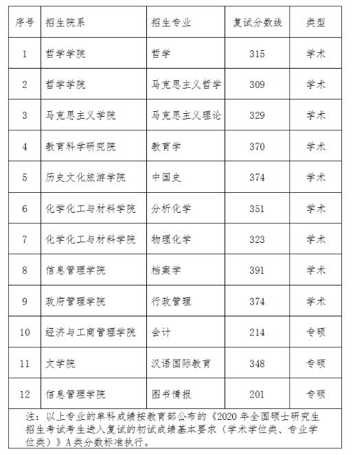 3.根據我校一志愿上線人數,除以下專業外,我校其他專業的復試分數線均采用教育部公布的《2020年全國碩士研究生招生考試考生進入復試的初試成績基本要求(學術學位類、專業學位類)》A類分數標準。