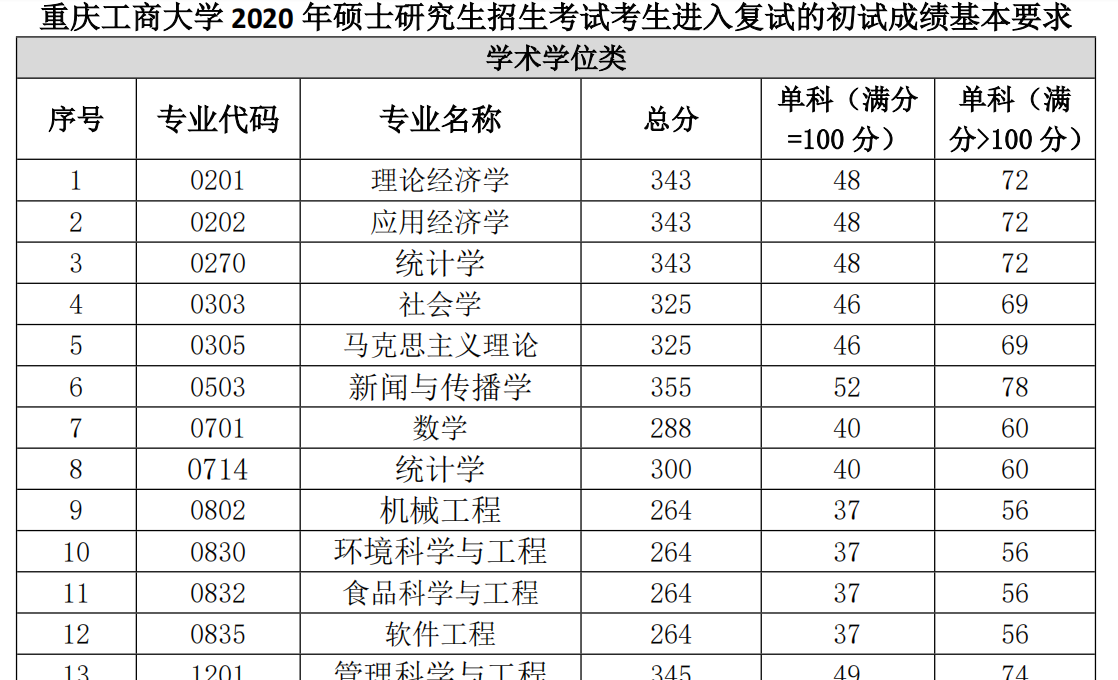 重慶工商大學(xué)2020年碩士研究生招生考試考生進(jìn)入復(fù)試的初試成績(jī)基本要求
