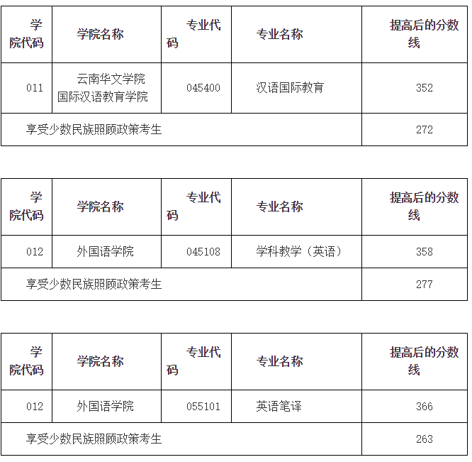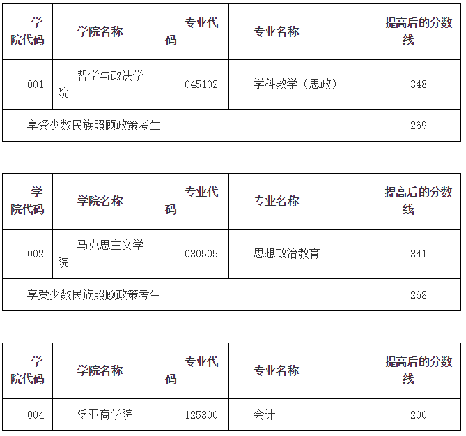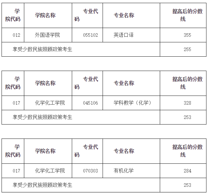根據(jù)《教育部關(guān)于印發(fā)<2020年全國(guó)碩士研究生招生工作管理規(guī)定>的通知》(教學(xué)〔2019〕6號(hào))、《2020年全國(guó)碩士研究生招生考試考生進(jìn)入復(fù)試的初試成績(jī)基本要求》(2020年國(guó)家線)、《教育部辦公廳關(guān)于做好2020年全國(guó)碩士研究生復(fù)試工作的通知》(教學(xué)廳〔2020〕4號(hào))等文件要求,以及上級(jí)部門的相關(guān)規(guī)定和關(guān)于統(tǒng)籌全日制、非全日制招生的相關(guān)要求,結(jié)合我校生源及招生計(jì)劃情況,提高以下上線人數(shù)較多專業(yè)的復(fù)試分?jǐn)?shù)線(不涉及退役大學(xué)生士兵專項(xiàng)計(jì)劃考生)。