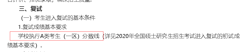 學校執(zhí)行A類考生(一區(qū))分數(shù)線(詳見2020年全國碩士研究生招生考試進入復試的初試成績基本要求)。