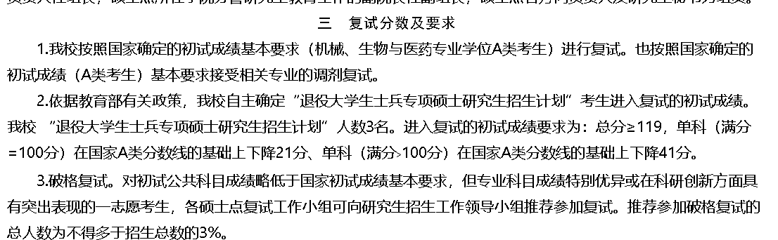 1.我校按照國家確定的初試成績基本要求(機械、生物與醫藥專業學位A類考生)進行復試。也按照國家確定的初試成績(A類考生)基本要求接受相關專業的調劑復試。