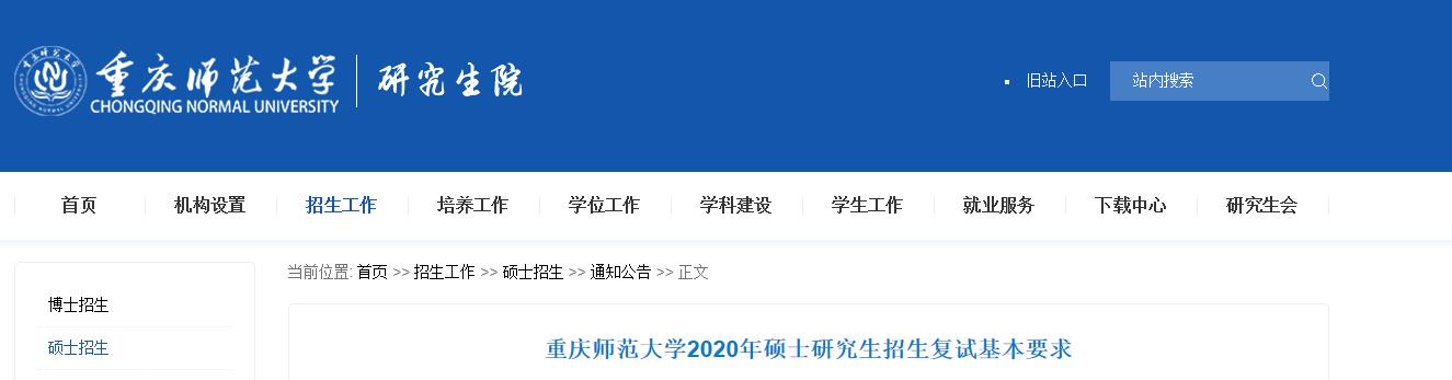 以上就是有關(guān)“2020考研分?jǐn)?shù)線:重慶師范大學(xué)2020年碩士研究生招生復(fù)試基本要求 ”的全部?jī)?nèi)容了,進(jìn)入復(fù)試的同學(xué)一定要好好準(zhǔn)備,在國(guó)家線徘徊的同學(xué)抓緊準(zhǔn)備調(diào)劑了!