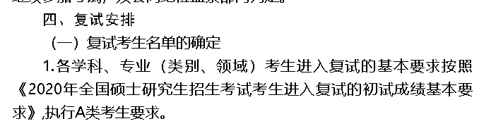 1.各學科、專業(類別、領域)考生進入復試的基本要求按照《2020年全國碩士研究生招生考試考生進入復試的初試成績基本要求》,執行A類考生要求。