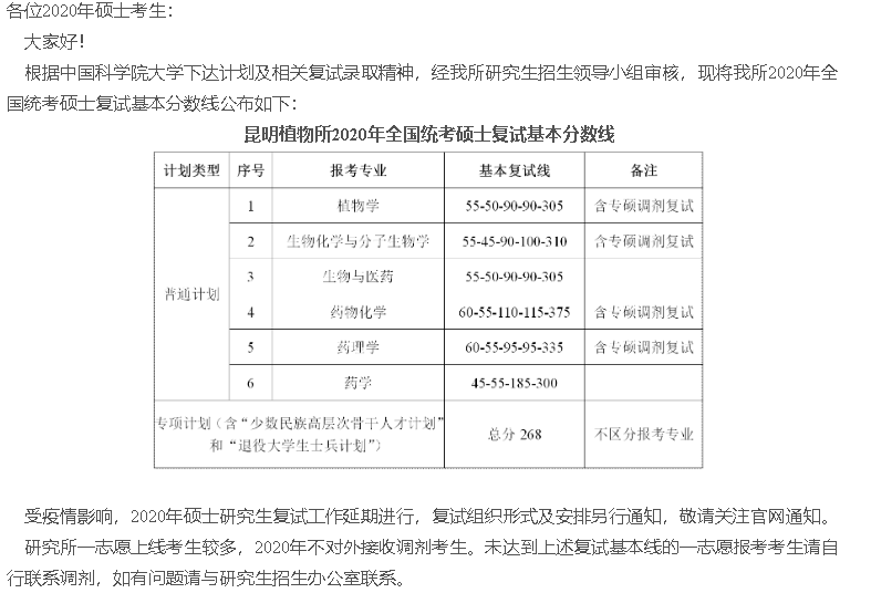 以上就是有關“2020考研分數線:中國科學院昆明植物研究所2020年考研復試分數線”的全部內容了,進入復試的同學一定要好好準備,在國家線徘徊的同學抓緊準備調劑了!