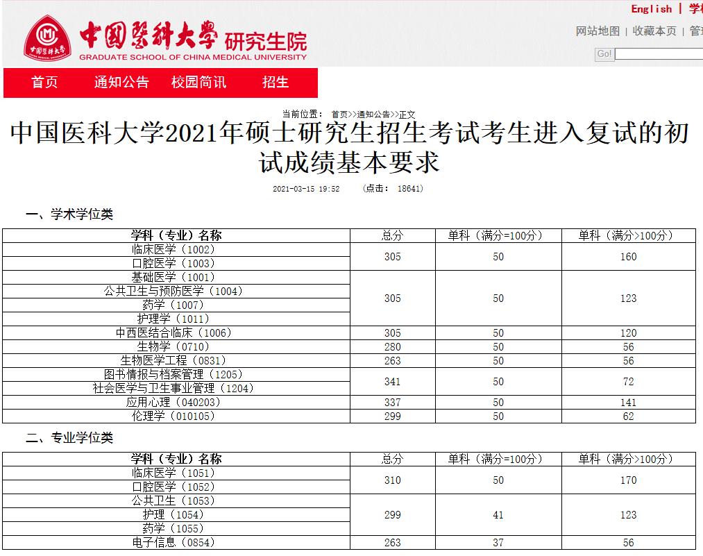 原文標題:中國醫科大學2021年碩士研究生招生考試考生進入復試的初試成績基本要求