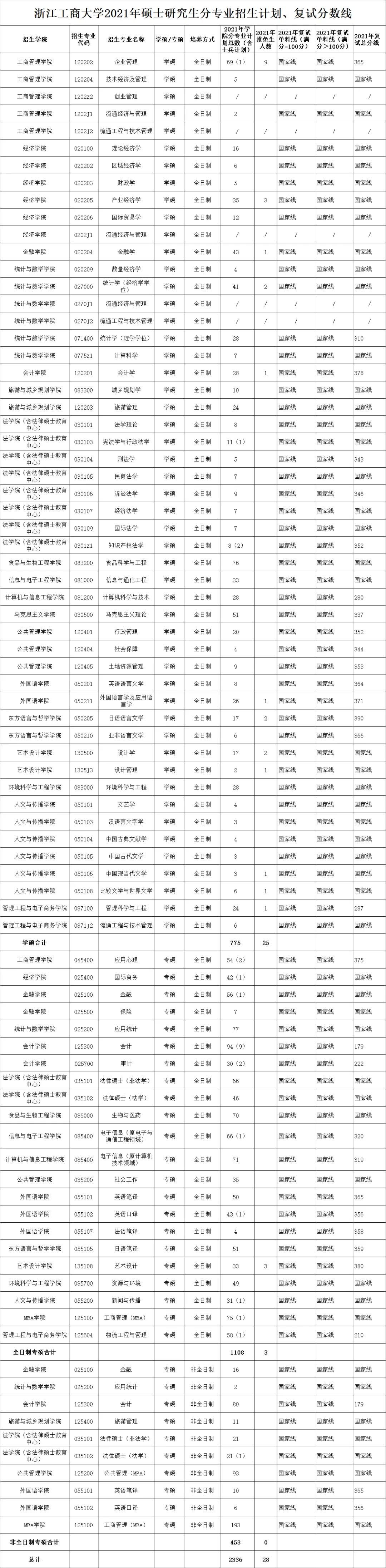 根據(jù)教育部《2021年全國碩士研究生招生工作管理規(guī)定》和《浙江工商大學2021年碩士研究生招生復試及錄取工作實施方案》要求,結合我校2021年碩士研究生招生計劃和一志愿考生上線情況,現(xiàn)將2021年碩士研究生分專業(yè)招生計劃、復試分數(shù)線和調劑信息公布如下: