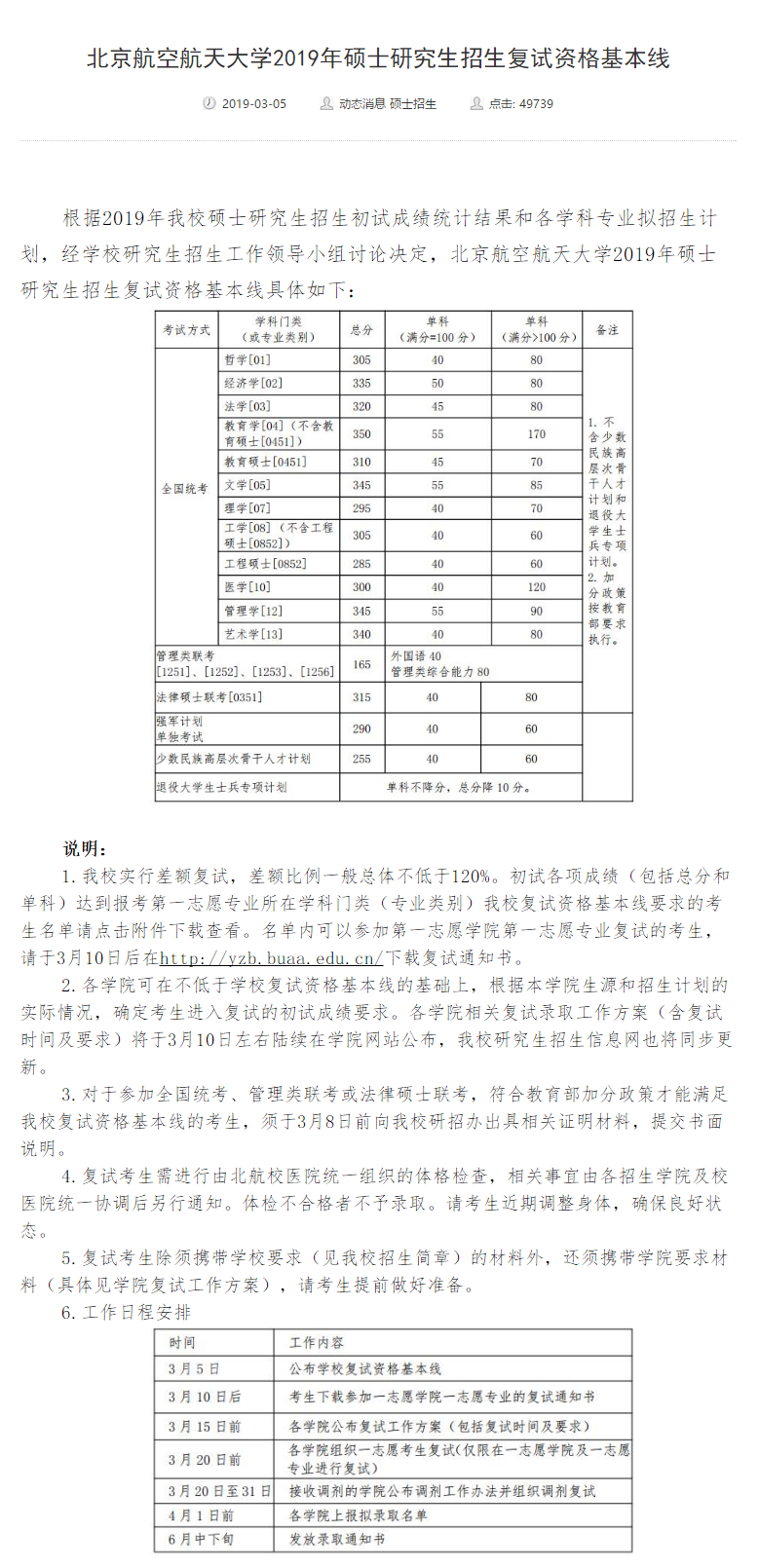 北京航空航天大學2019年碩士研究生招生復試資格基本線