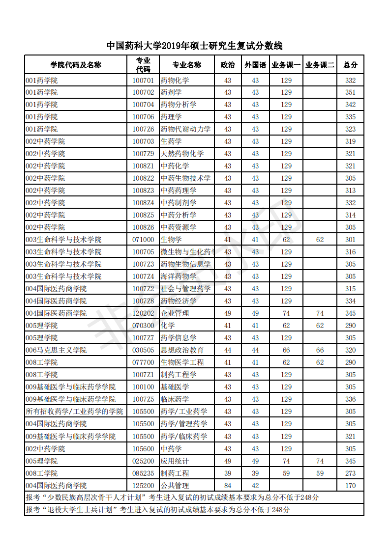 中國藥科大學2019年考研復試分數線