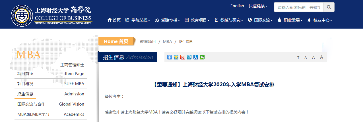 【重要通知】上海財經大學2020年入學MBA復試安排