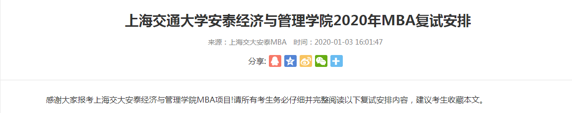 以上就是“2020MBA復試公告:上海交通大學安泰經濟與管理學院MBA復試工作安排通知”的全部內容,更多考研復試信息,請多多關注研線網!祝您考研成功!