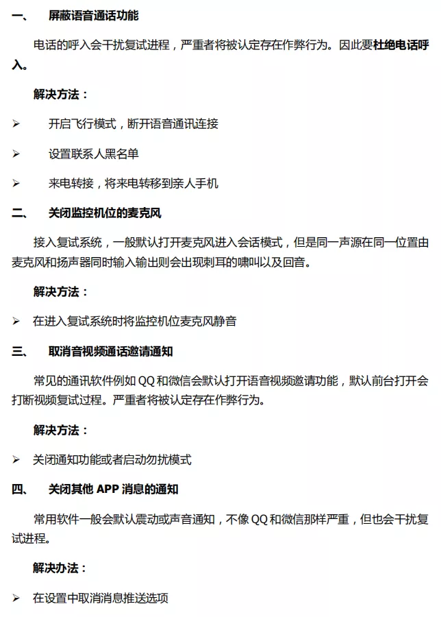可視范圍內(nèi)不能有任何復試相關資料,不得有其他人在場。