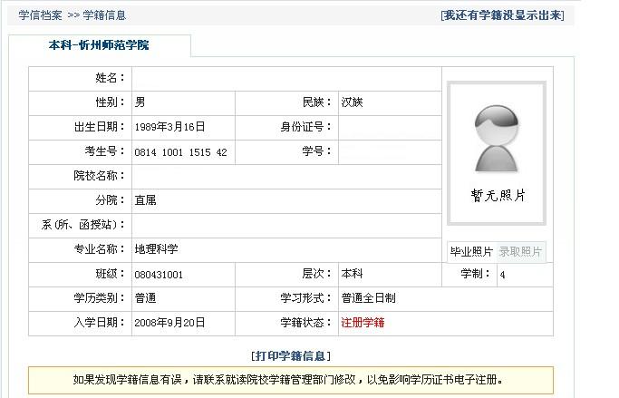 2、所有考生的資格審核以錄取結果上報教育部后的審核結果為準。若考生在學信網無法查詢到本人信息(見附圖2)或學信網備案信息與報考信息不符(均會造成教育部錄取審核無法通過,無法錄取),請立即與本科院校相關部門聯系以盡快更正或按以下辦法進行學籍學歷認證: