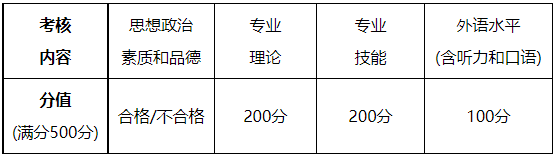 復試小組應集體研究、設置題目、形成題庫,需保證復試考生一人一題、隨機抽選。試題中需包含專業理論、專業技能和外語水平等相關考核內容。具體內容由各復試小組在保證公平性、科學性基礎上,依據專業特點和實際情況制定,復試考核內容分值如下表所示: