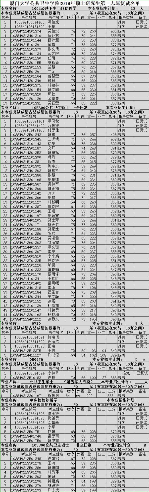 廈門大學公共衛(wèi)生學院2019年碩士研究生第一志愿復試通知