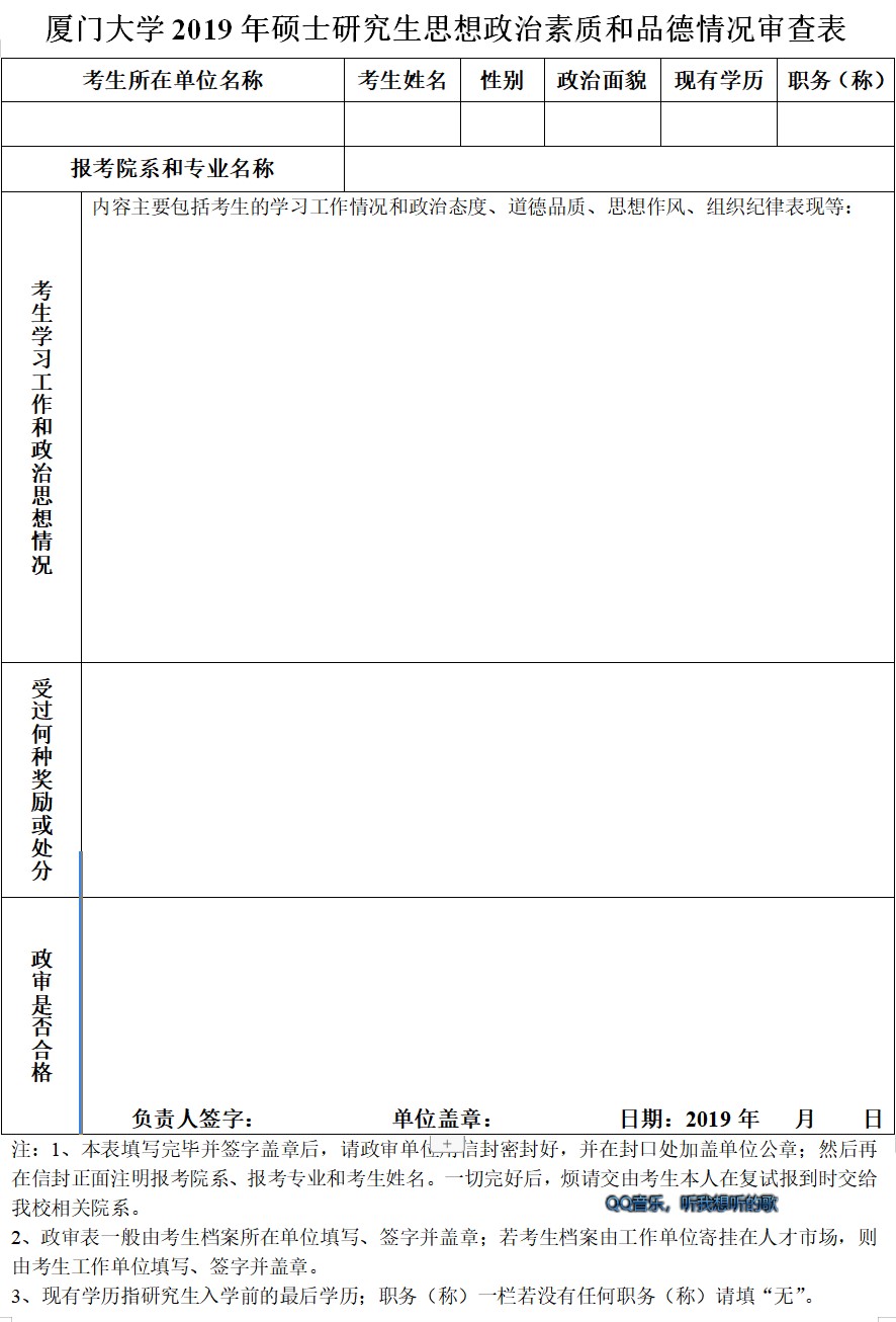1. 填寫完整并密封完好的《廈門大學 2019年碩士研究生政治表現(xiàn)情況審查表》(該表可在廈門大學招生辦網(wǎng)頁:http://zs.xmu.edu.cn 下載) ;