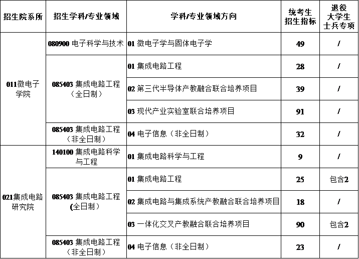 微電子學院/集成電路研究院2023年碩士研究生招生計劃指標共計621個。本次統考碩士研究生招生計劃具體如下表: