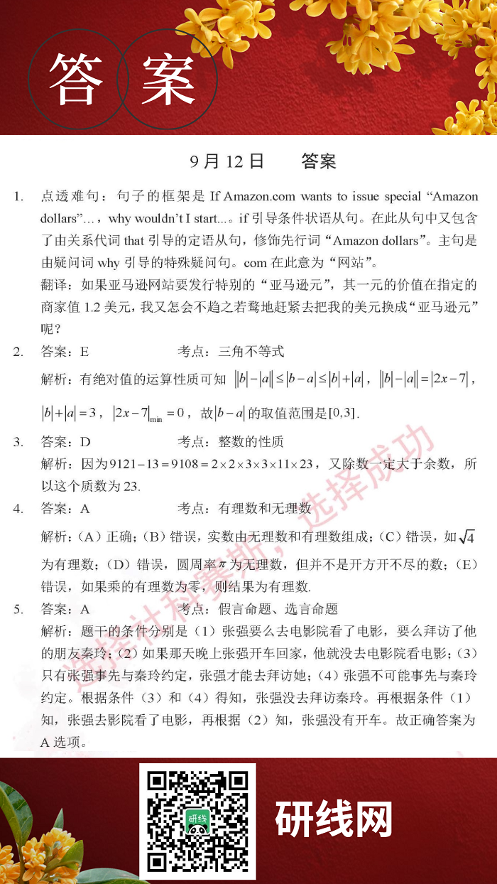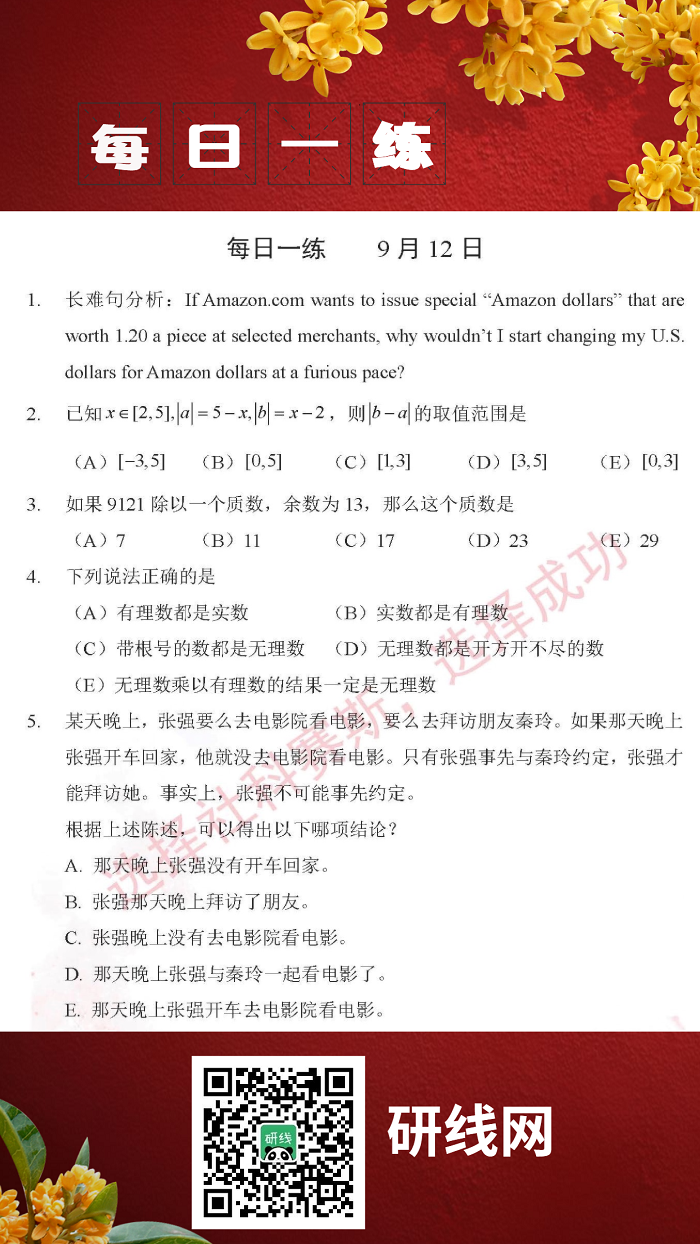 9月12日:2020考研管理類聯考每日一練以及答案