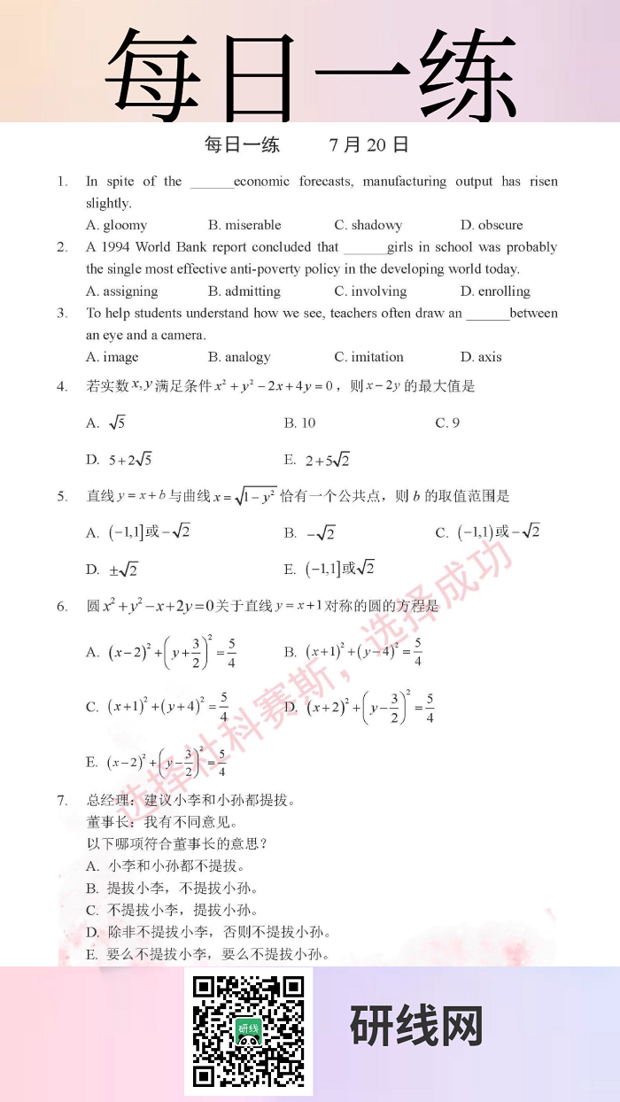 7月20日:2020考研管理類聯考每日一練以及答案