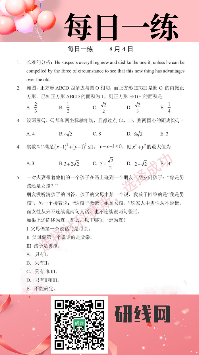 為了更好的復習和鞏固已經學過的知識,研線網小編為大家整理出幾道題,作為每日的練習,希望能夠幫助到同學們哦!