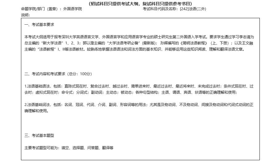 以上就是研線網小編整理了“2021考研大綱:深圳大學242法語(二外)2021年碩士研究生招生入學考試大綱”的內容,更多考研大綱,請多多關注!