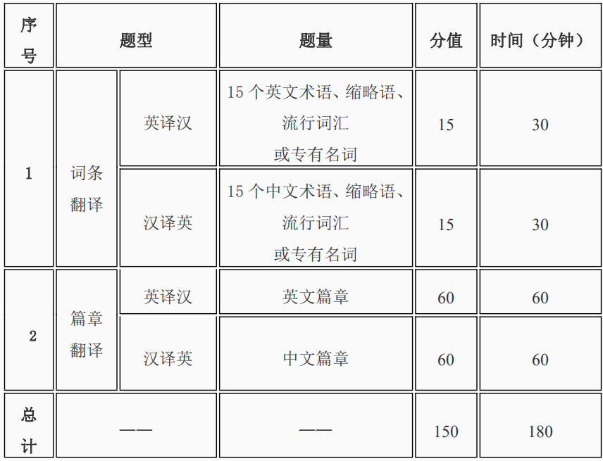 1、考試要求:要求應試者具備英漢互譯的基本技巧和能力;初步了解中國 和西方國家的社會、文化等背景知識;譯文忠實原文,無明顯誤譯、漏譯;譯文 通順,用詞正確、表達基本無誤;譯文無明顯語法錯誤;英譯漢速度每小時 250-350 個外語單詞,漢譯英速度每小時 150-250 個漢字。