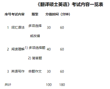 本考試是全國翻譯碩士專業(yè)學(xué)位研究生的入學(xué)資格考試,除全國統(tǒng)考分值100分的第一單元《政治理論》之外,專業(yè)考試分為三門,分別是第二單元外國語考試《翻譯碩士英語》,第三單元基礎(chǔ)課考試《英語翻譯基礎(chǔ)》以及第四單元專業(yè)基礎(chǔ)課考試《漢語寫作與百科知識(shí)》。《翻譯碩士(英語)》重點(diǎn)考察考生的英語水平,總分100分,《英語翻譯基礎(chǔ)》重點(diǎn)考察考生的英漢互譯專業(yè)技能和潛質(zhì),總分150分,《漢語寫作和百科知識(shí)》重點(diǎn)考察考生的現(xiàn)代漢語寫作水平和百科知識(shí),總分150分。(考試科目名稱及代碼參見教學(xué)司[2009]22號(hào)文件)。