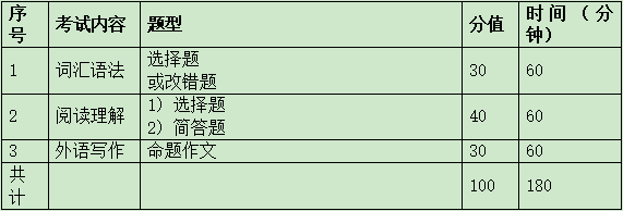 本考試包括以下部分:詞匯語法、閱讀理解、外語寫作等。總分為100分。