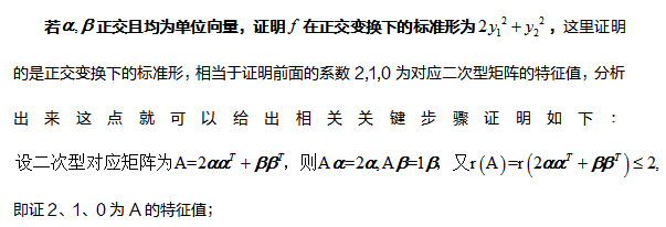 其次,我們需要了解了解二次型的秩和標準形等概念,其中二次型的秩可以通過矩陣的秩加以研究,而標準形要注意區分是正交變換法下的標準形還僅僅是非退化的線性變換,前者保持特征值不變,后者僅僅能夠保持正負慣性指數不變(特征值的符號/正負特征值的個數)這一點我們接著看這道試題的第二小問:
