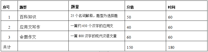 本考試包括三個部分:百科知識、應(yīng)用文寫作、命題作文。總分150分。