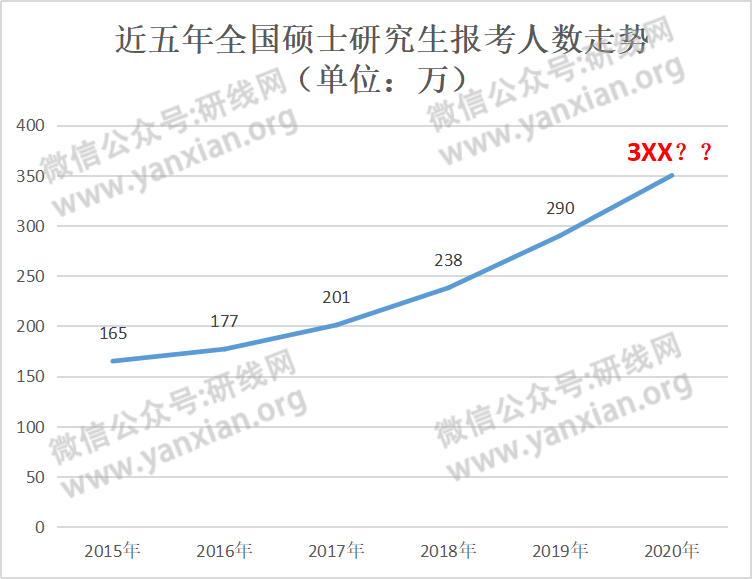 2019年考研報(bào)名人數(shù)290萬(wàn),比2018年多52萬(wàn),結(jié)合近5年報(bào)考人數(shù)和趨勢(shì)來(lái)看,可以得出,2020考研報(bào)考人數(shù)肯定會(huì)增加,預(yù)計(jì)不低于320萬(wàn)!