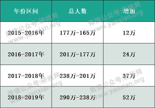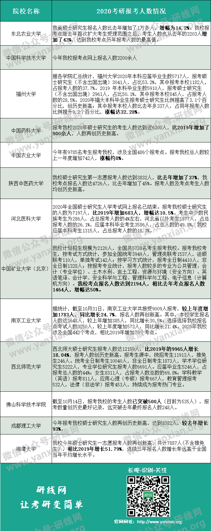 據(jù)現(xiàn)在研線菌已經(jīng)搜集到的數(shù)據(jù),成都理工大學(xué)較去年增長(zhǎng)93%、湘潭大學(xué)較去年增長(zhǎng)51.79%、中國(guó)礦業(yè)大學(xué)(北京)增幅近50%等等。各院校報(bào)考人數(shù)持續(xù)增加,且增長(zhǎng)百分比不小,相應(yīng)的2020考研報(bào)名總?cè)藬?shù)也將大幅度增長(zhǎng),預(yù)計(jì)不低于320萬(wàn)人。