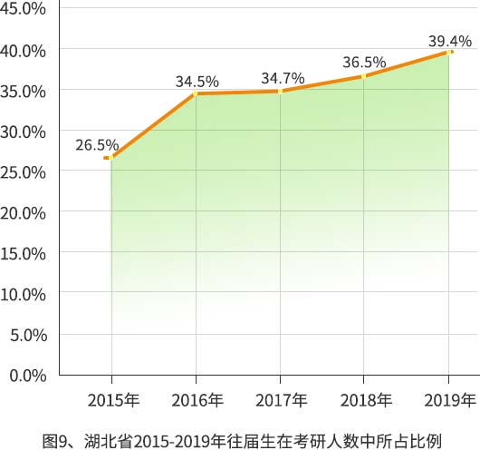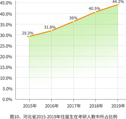 根據(jù)下圖湖北省、河北省2015-2019年往屆生在考研人數(shù)中所占比例可以看出,往屆生選擇考研的越來(lái)越多。