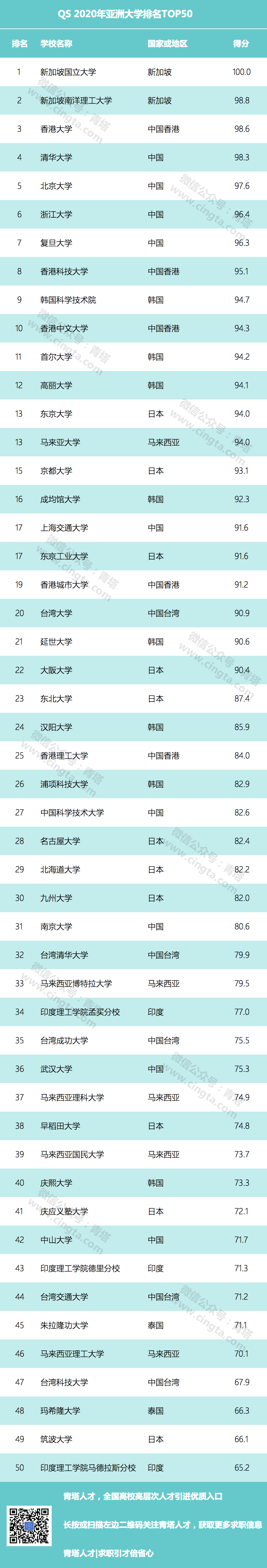QS發布的2020亞洲大學排名中,中國、日本、韓國、新加坡高校表現強勢,其中更是有七所中國高校進入亞洲TOP10。不過,前兩名都被新加坡高校奪得,分別是新加坡國立大學和南洋理工大學。香港大學位居第三。進入前十名的高校還包括清華大學、北京大學、浙江大學、復旦大學、香港科技大學、韓國科學技術院、香港中文大學等。