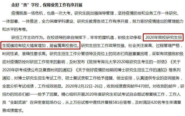 3月31日,湖北大學(xué)官網(wǎng)發(fā)布了一則《【抗擊疫情】研究生院念好“三字經(jīng)” 促進(jìn)疫情防控和業(yè)務(wù)工作兩手抓雙促進(jìn)》的內(nèi)容,其中提到:湖北大學(xué)2020年研究生招生規(guī)模將有較大幅度增加,居省屬高校首位。