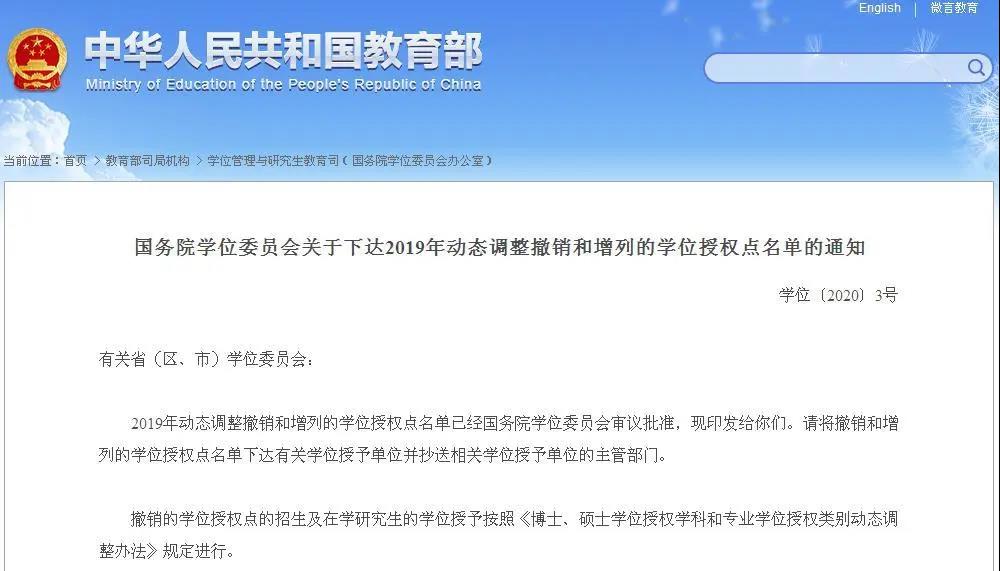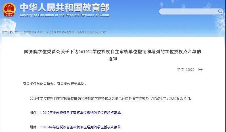 同日,國務院學位委員會還公布了《關于下達2019年動態調整撤銷和增列的學位授權點名單的通知》,在本次調整中,各大高校或單位共撤銷193個學位點,新增231個學位點。