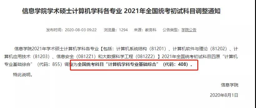 中國人民大學信息學院公布學術碩士計算機學科各專業2021年全國統考初試科目調整通知,其中全國統考科目四原“計算機基礎綜合”(代碼855)調整為全國統考科目“計算機學科專業基礎綜合”(代碼408)。