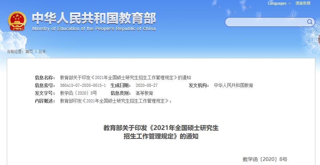 教育部關(guān)于印發(fā)《2021年全國碩士研究生招生工作管理規(guī)定》的通知