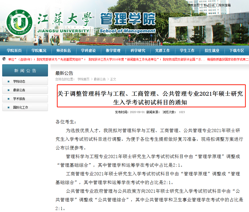 昨日,江蘇大學管理學院公布了《關于調整管理科學與工程、工商管理、公共管理專業2021年碩士研究生入學考試初試科目的通知》。學院擬對管理科學與工程、工商管理、公共管理專業2021年碩士研究生入學考試初試科目進行調整。