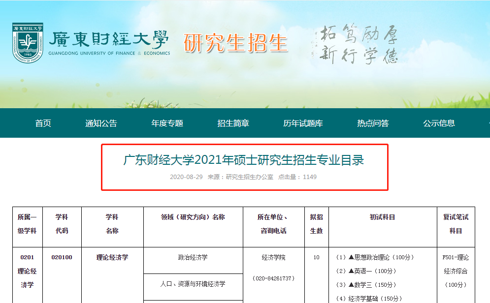 廣東財經大學公布2021年碩士研究生招生專業目錄。