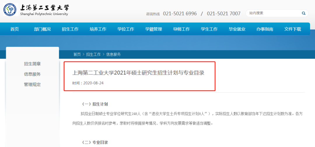 上海第二工業大學公布2021年碩士研究生招生計劃與專業目錄。