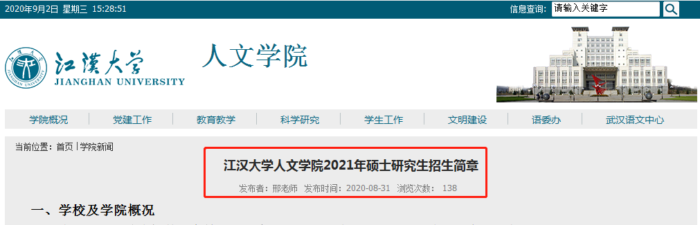 江漢大學人文學院發布2021年碩士研究生招生簡章。