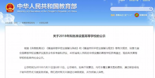公示指出,根據《高等教育法》《普通高等學校設置暫行條例》和《普通本科學校設置暫行規定》等有關規定,經第七屆全國高等學校設置評議委員會專家考察和評議,40所省級人民政府申報設置的高等學校獲得通過。