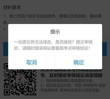 ● 其他網(wǎng)上確認(rèn)需要的材料,請(qǐng)按報(bào)考點(diǎn)規(guī)定上傳,確保清晰,如沒(méi)有可不上傳,最后確認(rèn)無(wú)誤提交后,等待報(bào)考點(diǎn)審核網(wǎng)上確認(rèn)信息。