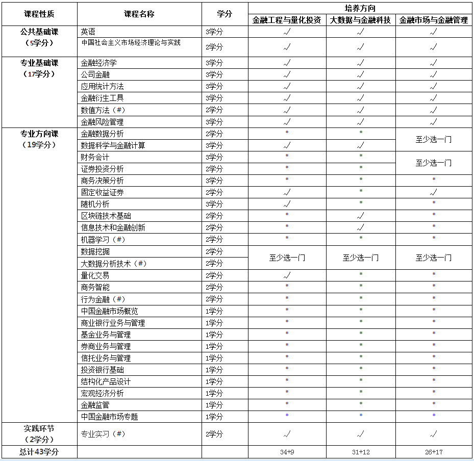 備注:1)打?qū)μ?hào)者為該方向必修課,打星號(hào)者為該方向選修課。對(duì)于每個(gè)方向,公共基礎(chǔ)課、專業(yè)基礎(chǔ)課和方向必修課均為必修課程。學(xué)生必須選擇一個(gè)方向,且修滿該方向規(guī)定的必修和選修學(xué)分。2)課程可能會(huì)有增補(bǔ)與調(diào)整,以開學(xué)實(shí)際開課計(jì)劃為準(zhǔn)。 3)帶#的課程為Olin商學(xué)院認(rèn)可學(xué)分的課程(其中,行為金融、機(jī)器學(xué)習(xí)、大數(shù)據(jù)分析技術(shù)三門課中只能選擇一門作為認(rèn)可課程)