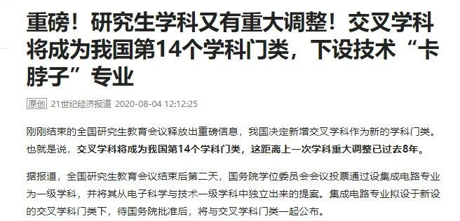 2020年7月,全國(guó)研究生教育會(huì)議釋放出重磅信息,我國(guó)決定新增交叉學(xué)科作為新的學(xué)科門(mén)類,集成電路將成為一級(jí)學(xué)科。